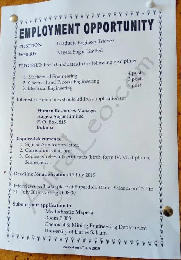 8 Fresh Graduate Job Opportunities at Kagera Sugar Company Limited | Deadline: 15th July, 2019